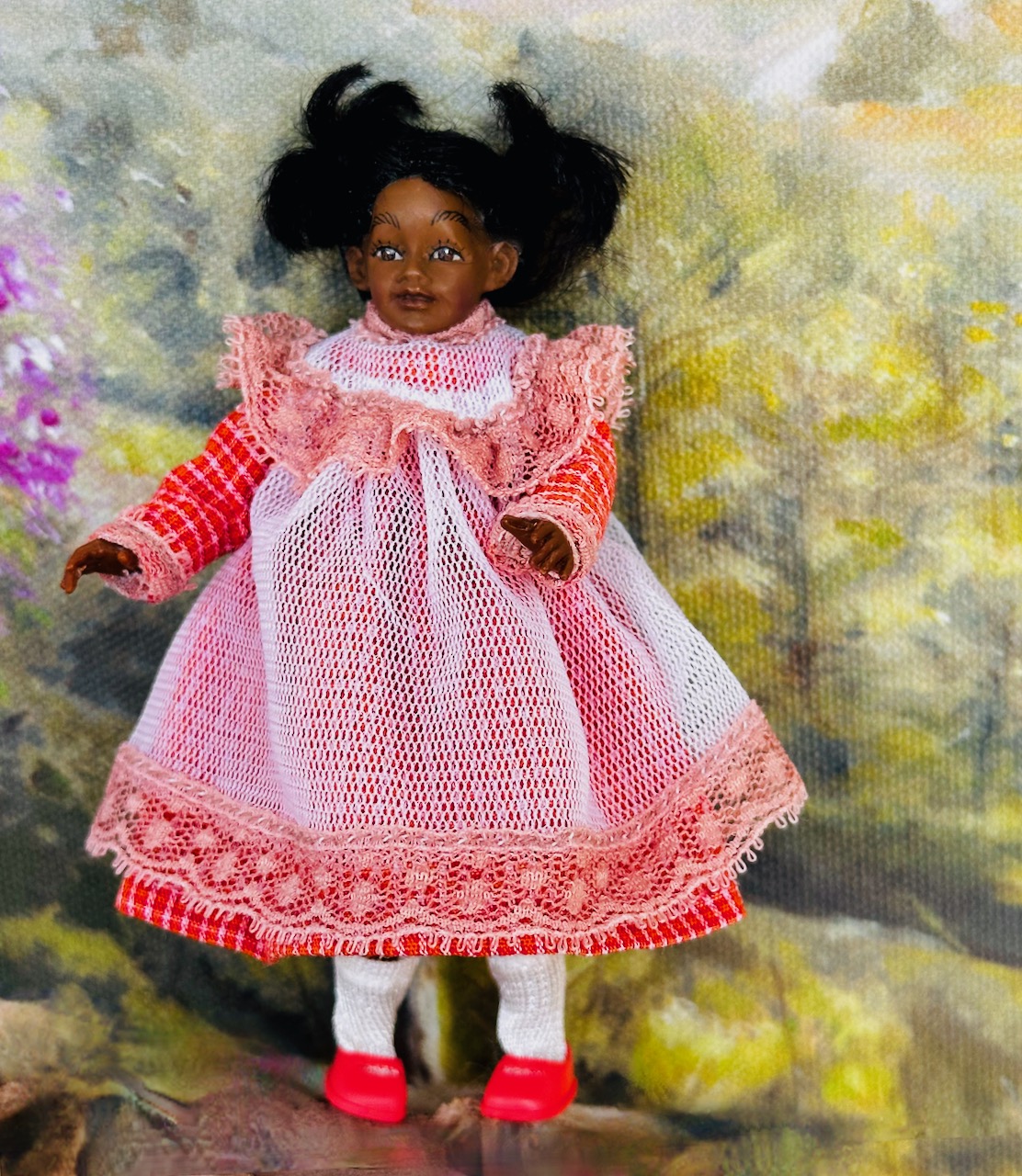 handgeknüpfte Mohair Perücke, Kleid mit Schürze, Socken und Schuhe.