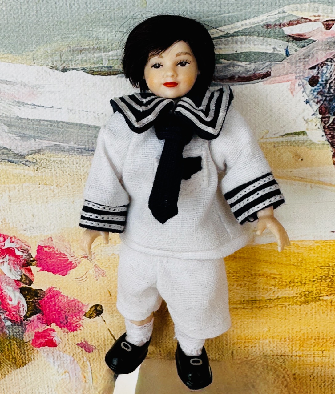 handgeknüpfte Mohair Perücke, Matrosen Anzug 2 Teile, Socken und Schuhe.